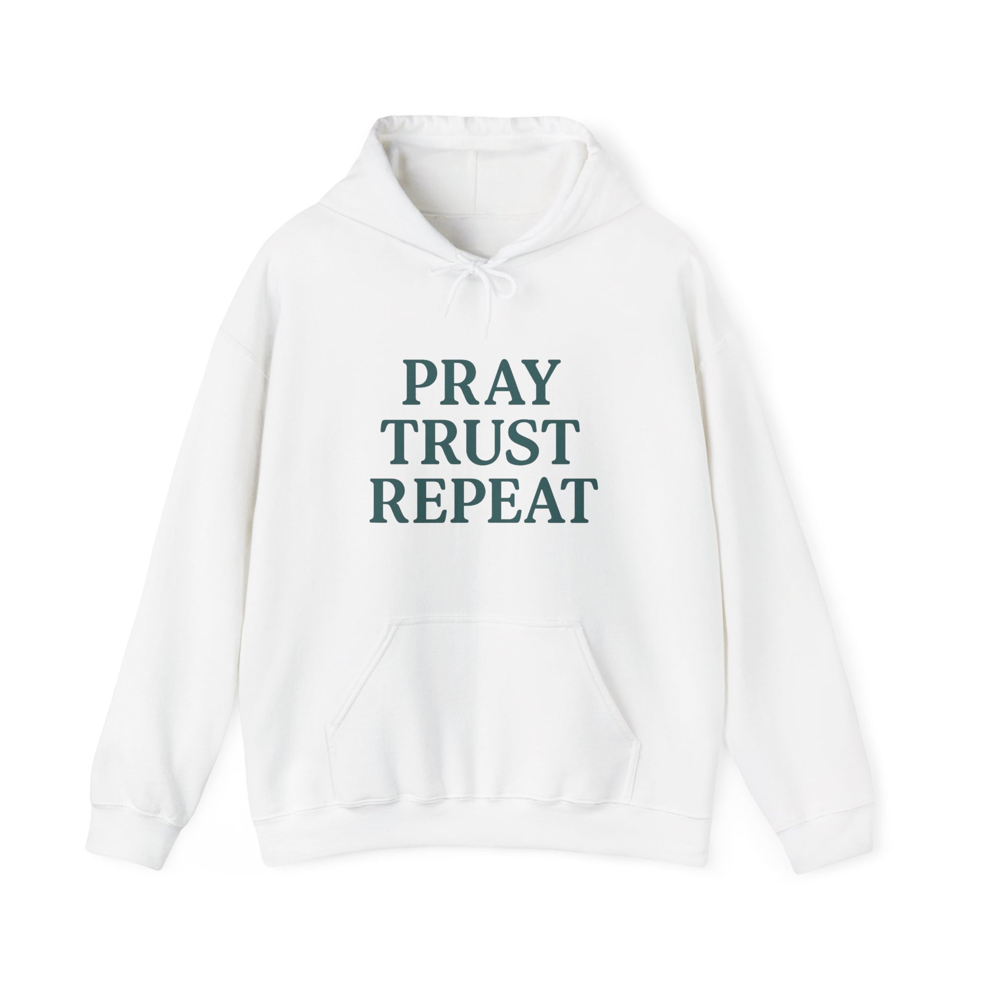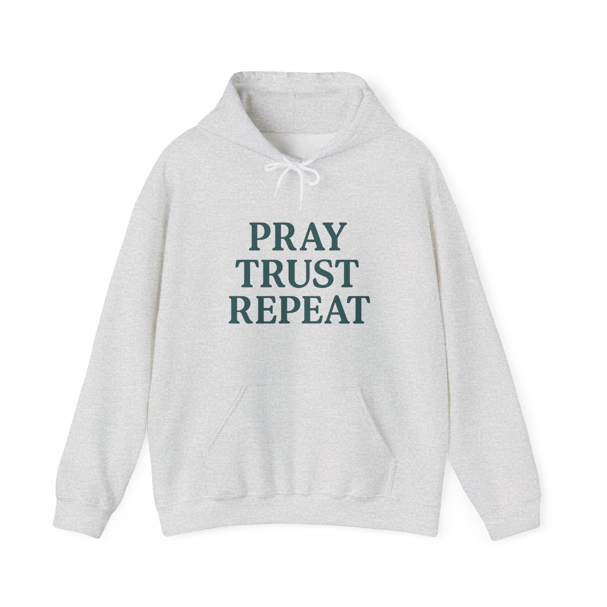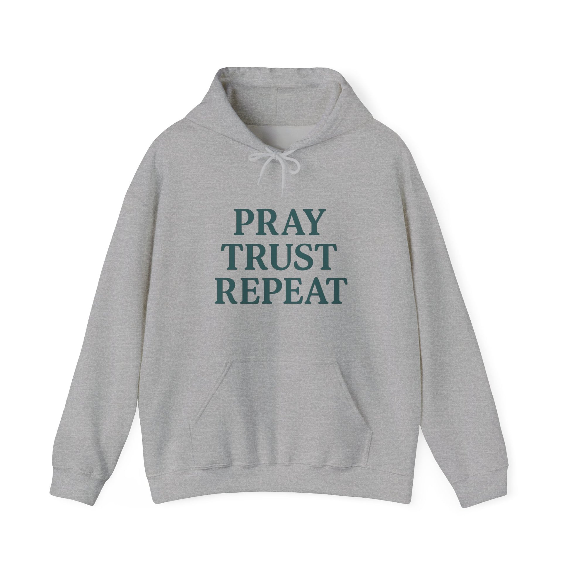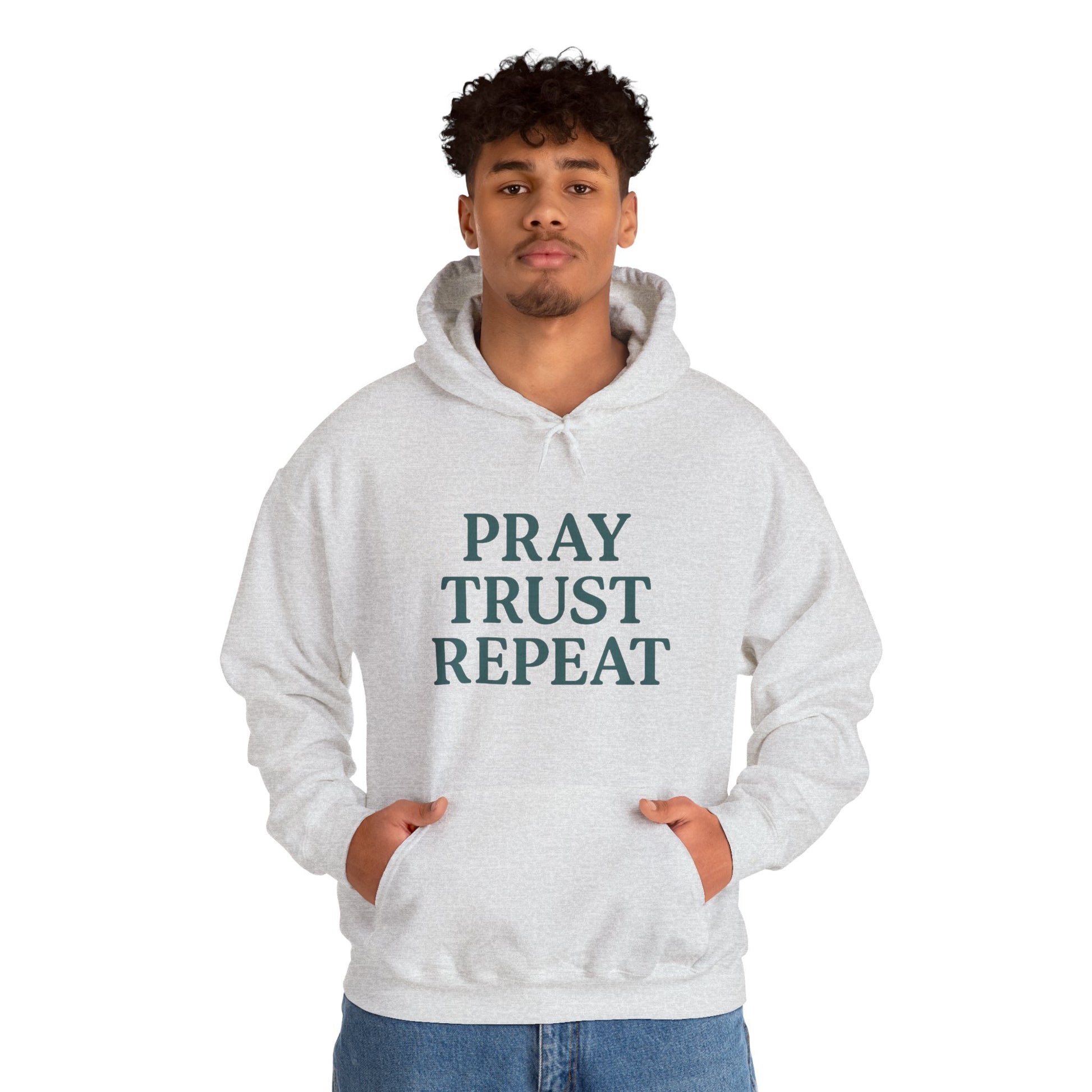 Introducing this cozy Unisex Heavy Blend™ Hooded Sweatshirt, perfect for anyone looking to wrap themselves in comfort while making a statement. With its eye-catching design featuring the motivational phrase, 'Pray Trust Repeat,' this sweatshirt evokes a positive and uplifting vibe. Ideal for casual outings, cozy nights in, or even spiritual gatherings, it effortlessly fits into a variety of lifestyles. It's a perfect gift for friends, family, or even yourself—especially during holidays like Christmas, or occasions like birthdays and celebrations of faith. Whether you’re lounging at home, heading out for errands, or attending a religious event, this sweatshirt serves as a gentle reminder to stay grounded and hopeful.