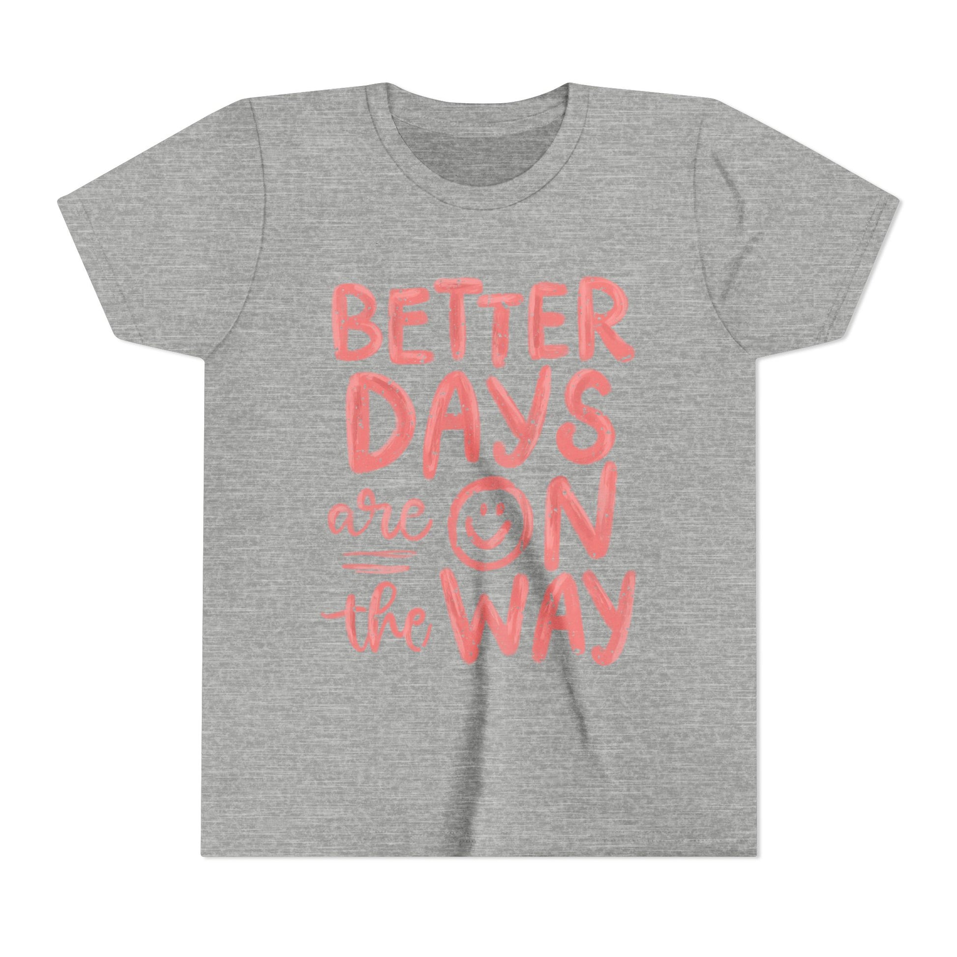 Introducing the perfect Youth Short Sleeve Tee that infuses positivity into daily life! This tee features a heartwarming message, "Better Days are ON the Way," paired with an inviting smiley design. It’s a delightful addition to any young wardrobe, ideal for school days, playdates, or casual family outings. Crafted from soft, breathable materials, it ensures maximum comfort, allowing kids to move freely while expressing their vibrant spirit. This tee is perfect for gifting on birthdays, holidays, or just as a special surprise to uplift a little one's day! Its versatile style makes it suitable for a variety of occasions, from summer adventures to cozy indoor activities. Designed for kids who love to wear their happiness and positivity, this shirt is as charming as it is comfortable!