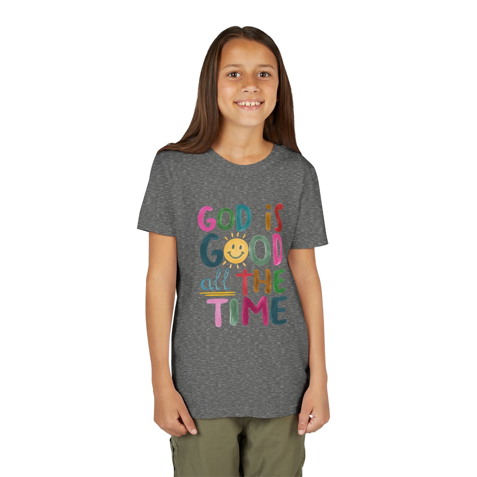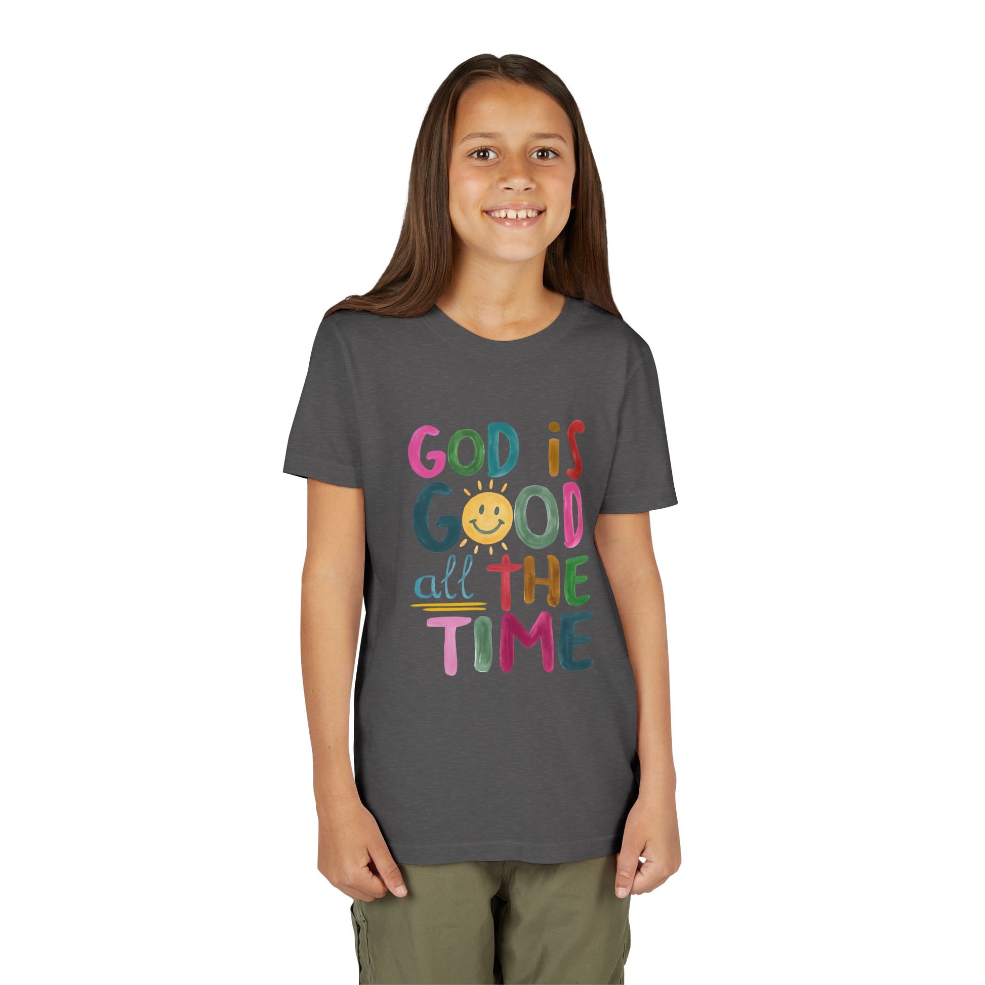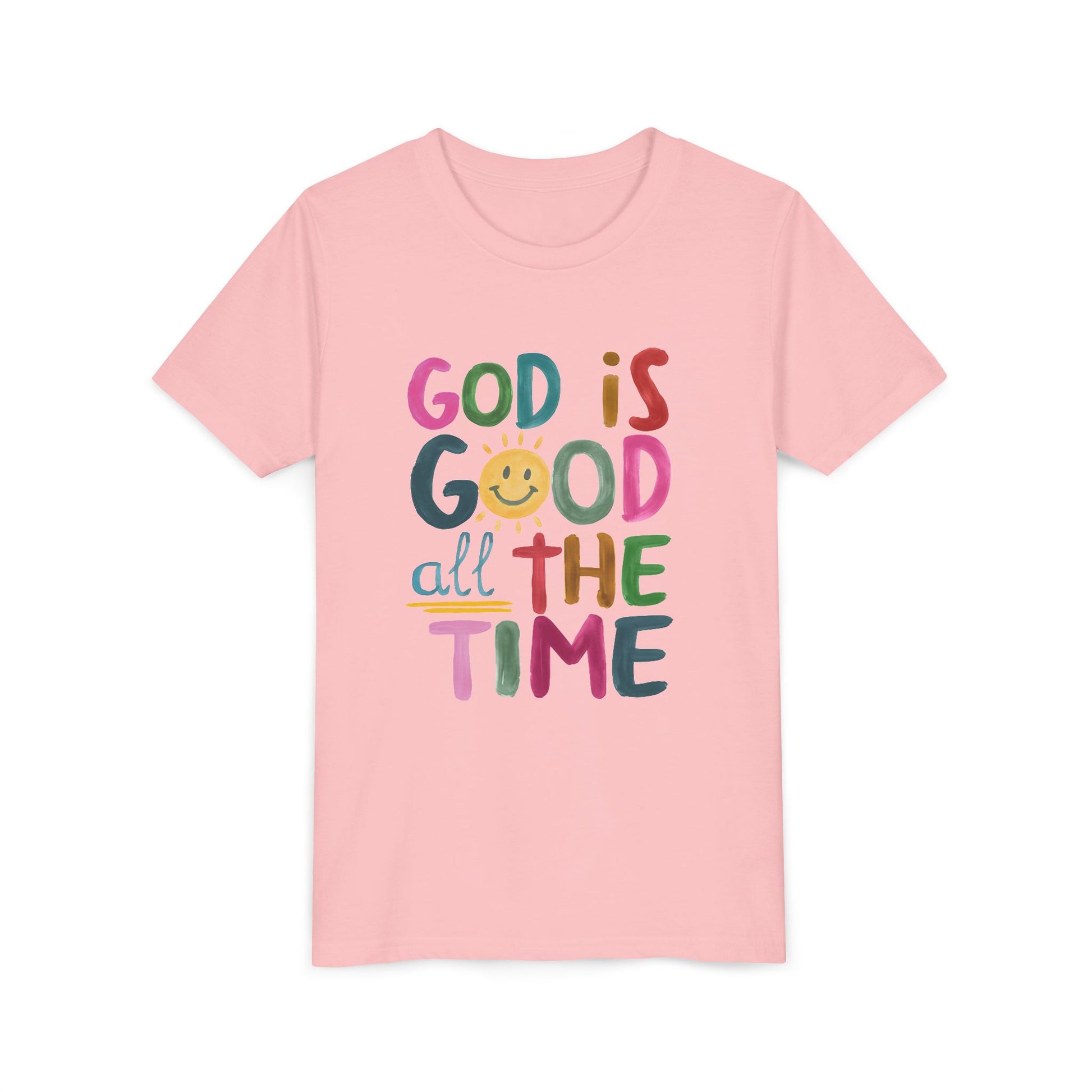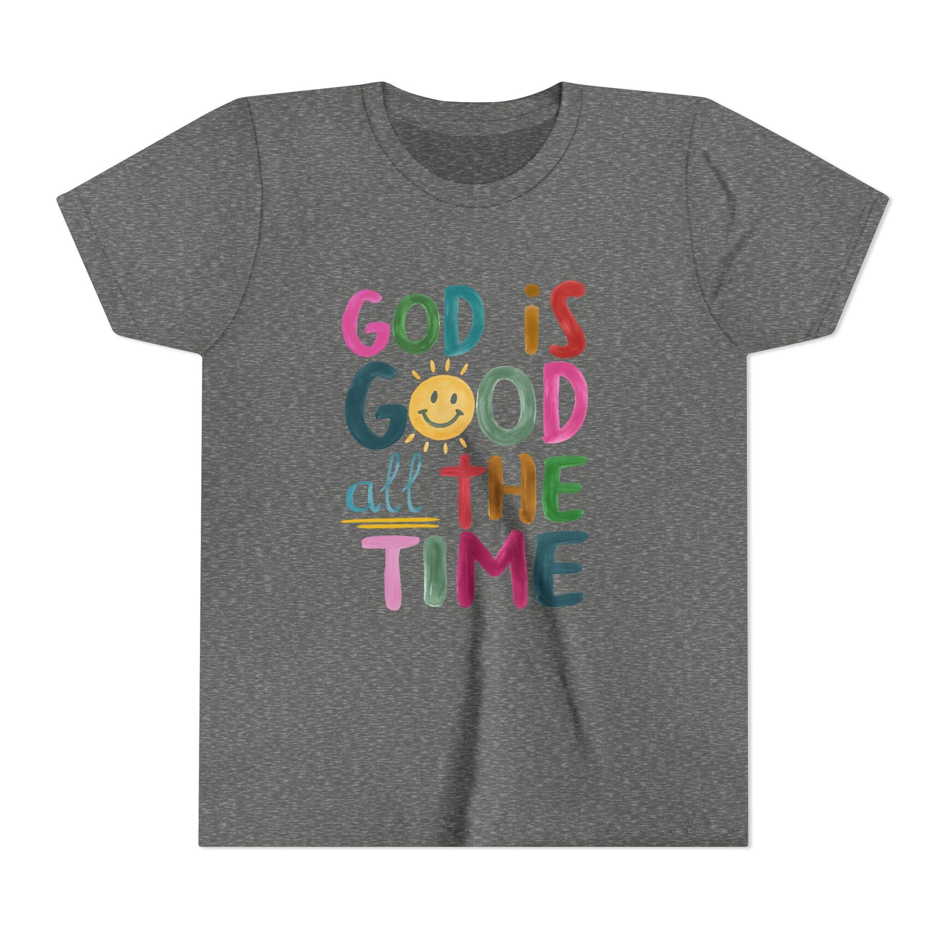 Celebrate faith and positivity with this vibrant Youth Short Sleeve Tee. The cheerful design featuring the uplifting phrase 'God is Good All the Time' radiates joy and encourages meaningful conversations. Perfect for casual outings, church events, or family gatherings, this tee is more than clothing—it's a message of hope and love. Ideal for kids who love to express their beliefs, this shirt is a great gift for birthdays, holidays, or just because. Elevate your child's wardrobe and let them share their light with the world!